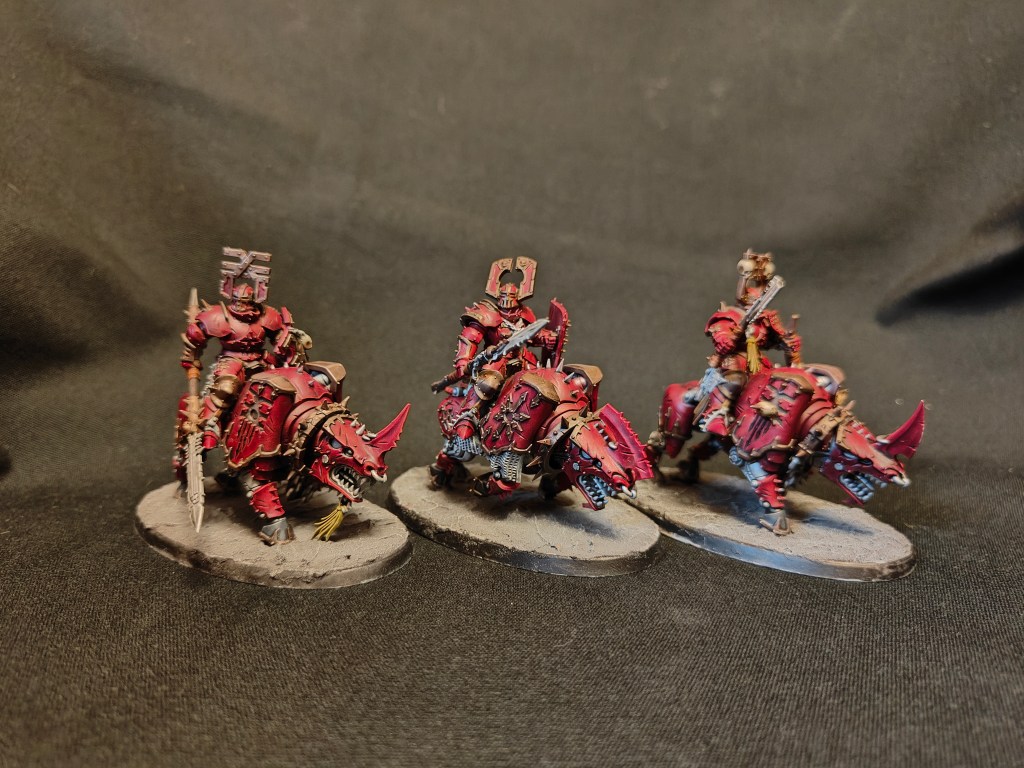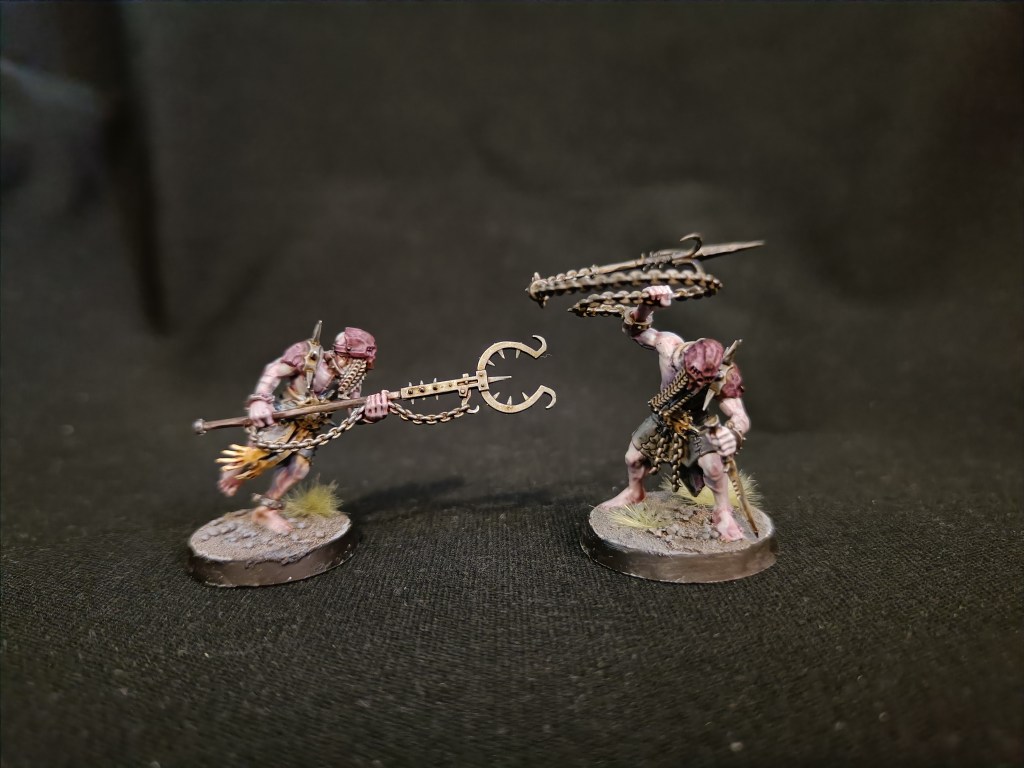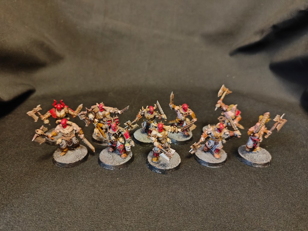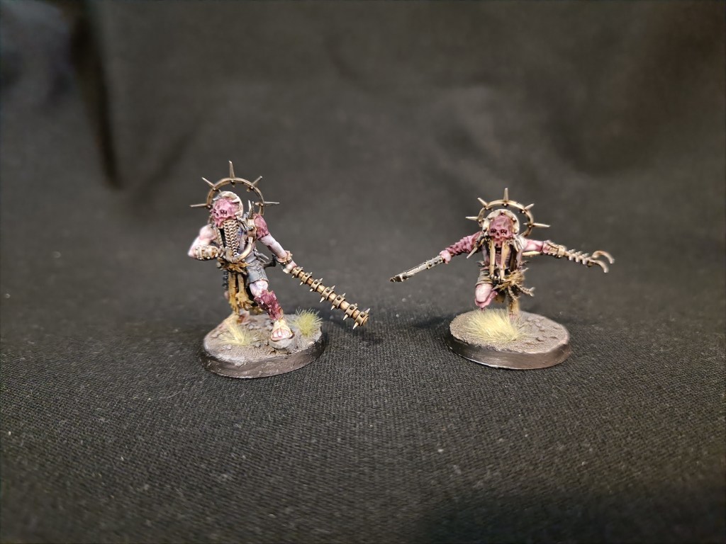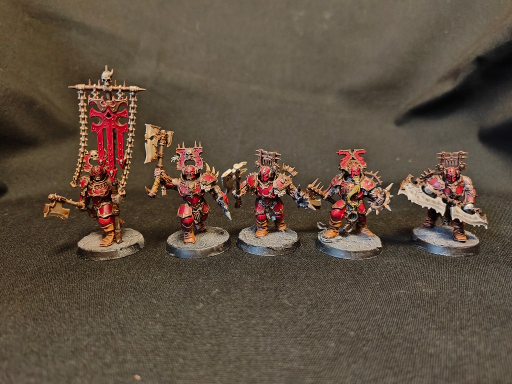3D printed too big, and as such they are quite unwieldy to base and align. These are a Dakkadakka sculpt with quite a bit of modifications made by me. The Hammers on the original sculpt were too big, so only my champion wields one of them.