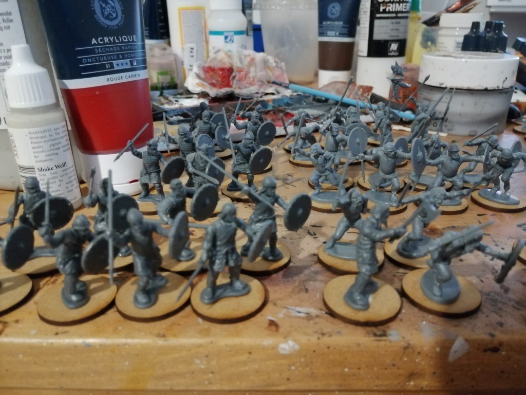 The logic in making them was: Celtic warriors depict the Scots and welsh. They need a lot of spear and javelin armed soldiers. This needed a bit of kitbashing, as the most of them came with swords already molded to the bodies. Thankfully the other boxes had a lot to spare. The saxon thengs and viking bondi boxes works for both the viking anglo factions, as historically they kind of had similar kind of clothing. The differentiating factor becomes the head as the boxes comes with nice sculpted heads, for the factions appropriate. The dark age box makes the peasant rabble armed with slings and javelins for the factions, to be shared.