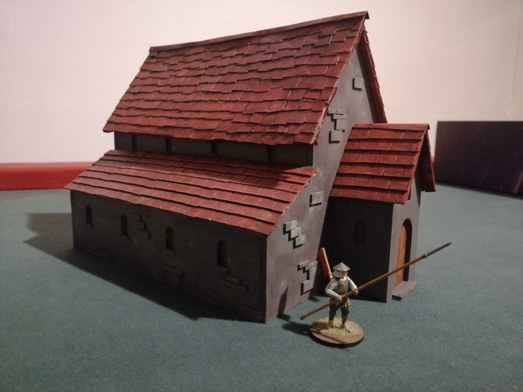 Here we have a saxon monastery, kind of similar that should have been found at Lindisfarne when the first Vikings came looking for riches. As you can see, the roof looks a bit.. “man-made”. This is because my 3-d printer broke and had to make the shingles the tried and true way of manually cutting them out with a scissor. Interested in the file? here it is: https://www.thingiverse.com/thing:1791150. Printed at 130% scale if I remember correctly.