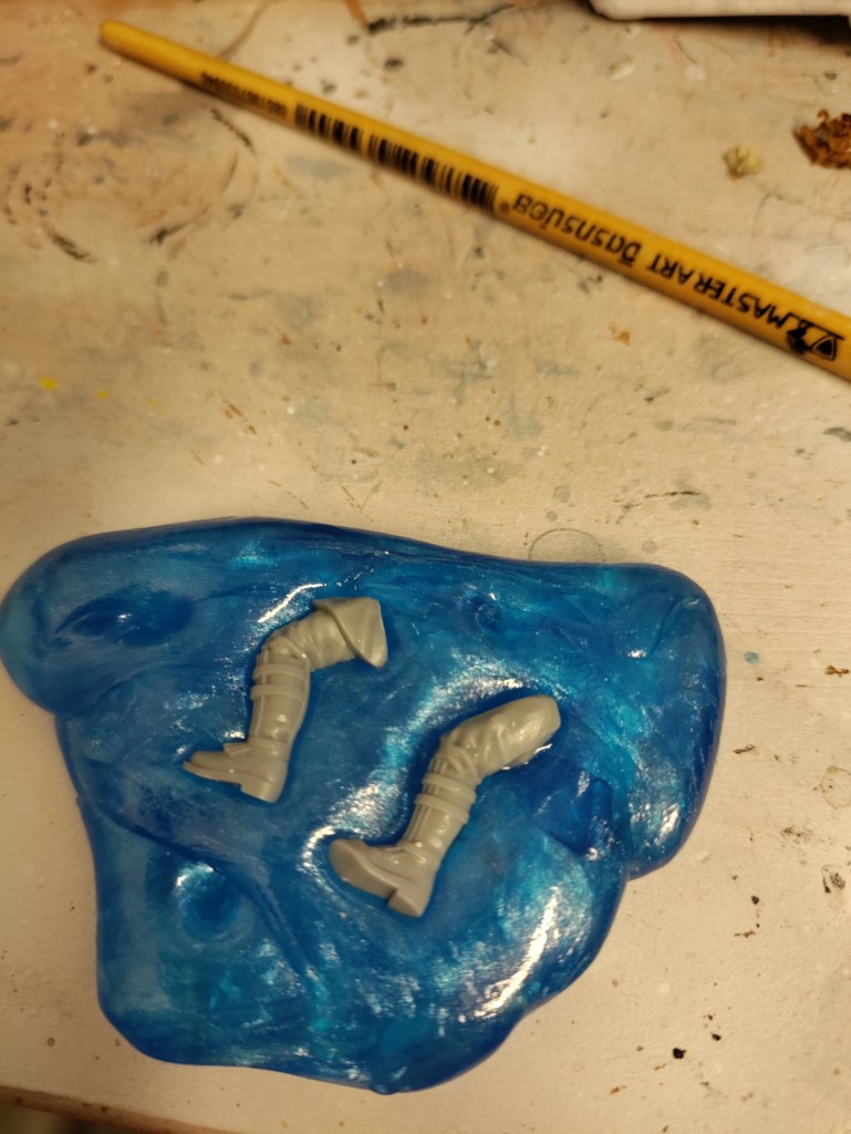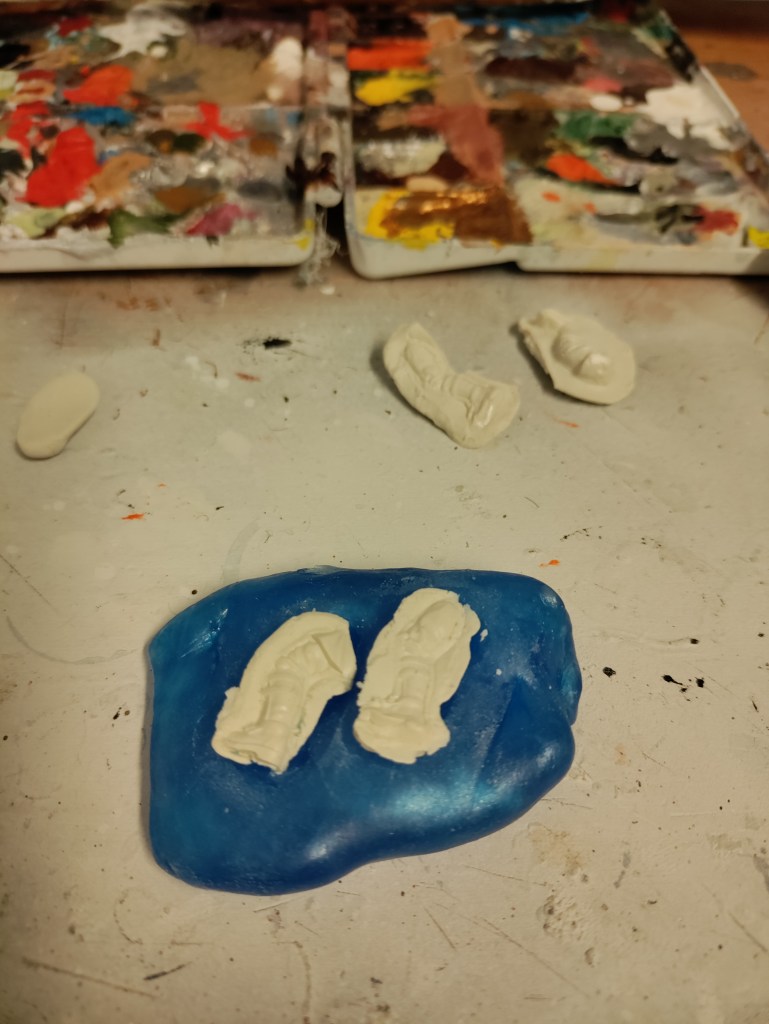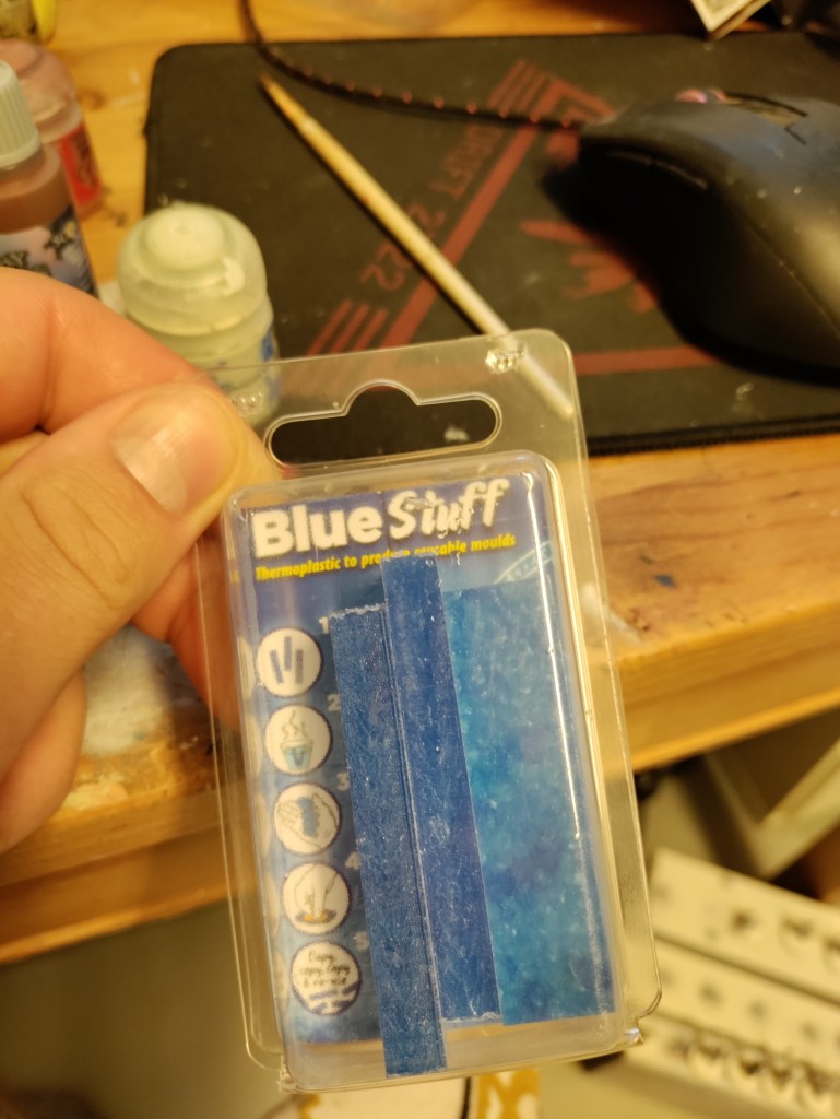 For those that don’t know what blue stuff is, it is a thermo plastic used to make reusable molds. This means you can make a 2 part mold and copy stuff that the manufacturers of minis only might include one of in the sprue etc.