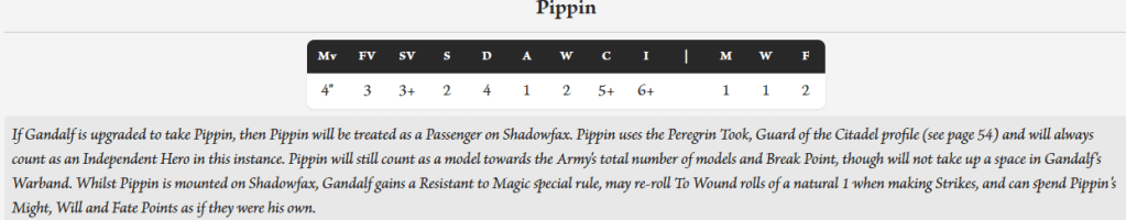 Not quite useless, but barely useful as extra Will, Fate and might points if mounted with Gandalf on Shadowfax. Only useful on foot if you really need to tag an objective as you quite literally, can throw him off the horse , or if you are running a fluffy list.